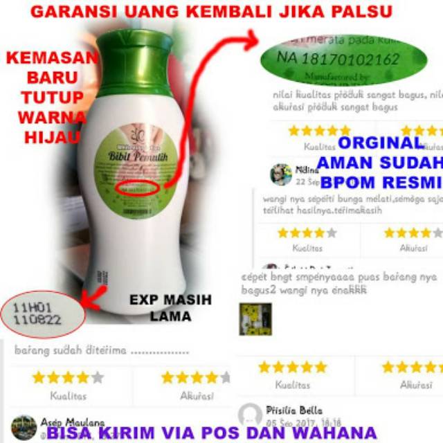 Bibit Collagen membuat tampilan kulit menjadi lebih putih bercahaya kenyal dan terasa halus. Selain itu ada pula kandungan astaxanthin sebagai anti-oksidan dan mampu mengatasi masalah kusam. 45000- per botol 1 botol berisi 500ml cream pemutih.